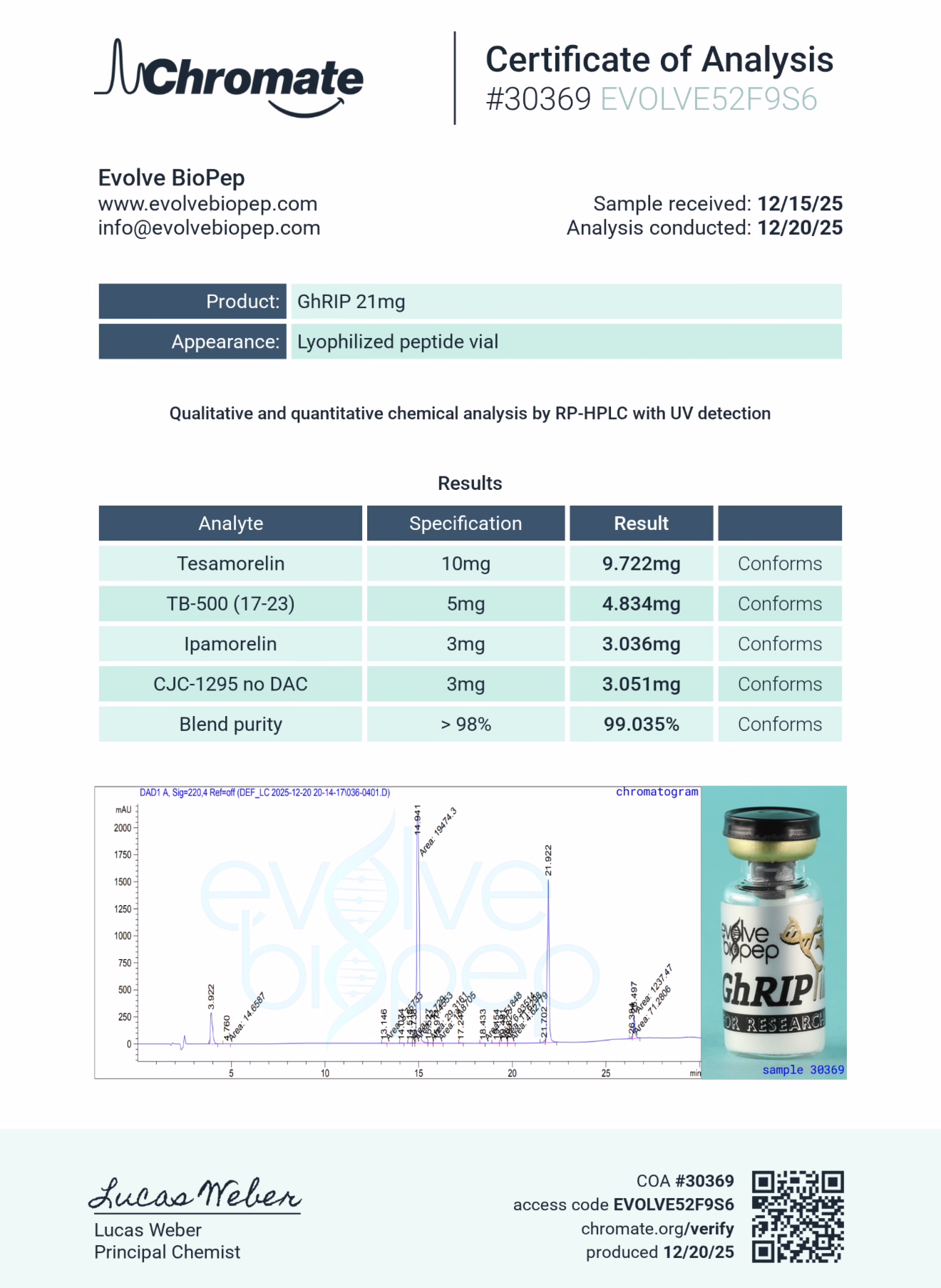 EvolvE BioPep guarantees the labeled mass and purity of all research compounds at the time they leave our facility, as verified by internal quality control and independent third-party analytical testing.