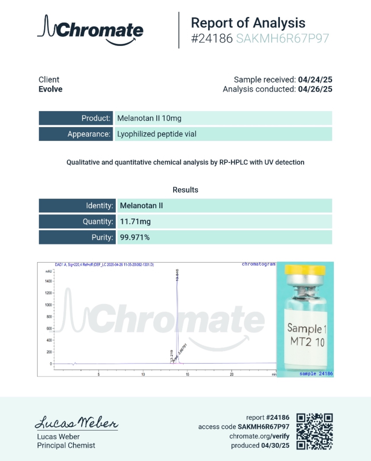 If independent confirmation is desired, identity and purity may be assessed by any properly equipped laboratory using standard analytical methods, including but not limited to HPLC, UV-Vis spectroscopy, pH analysis, or mass spectrometry.