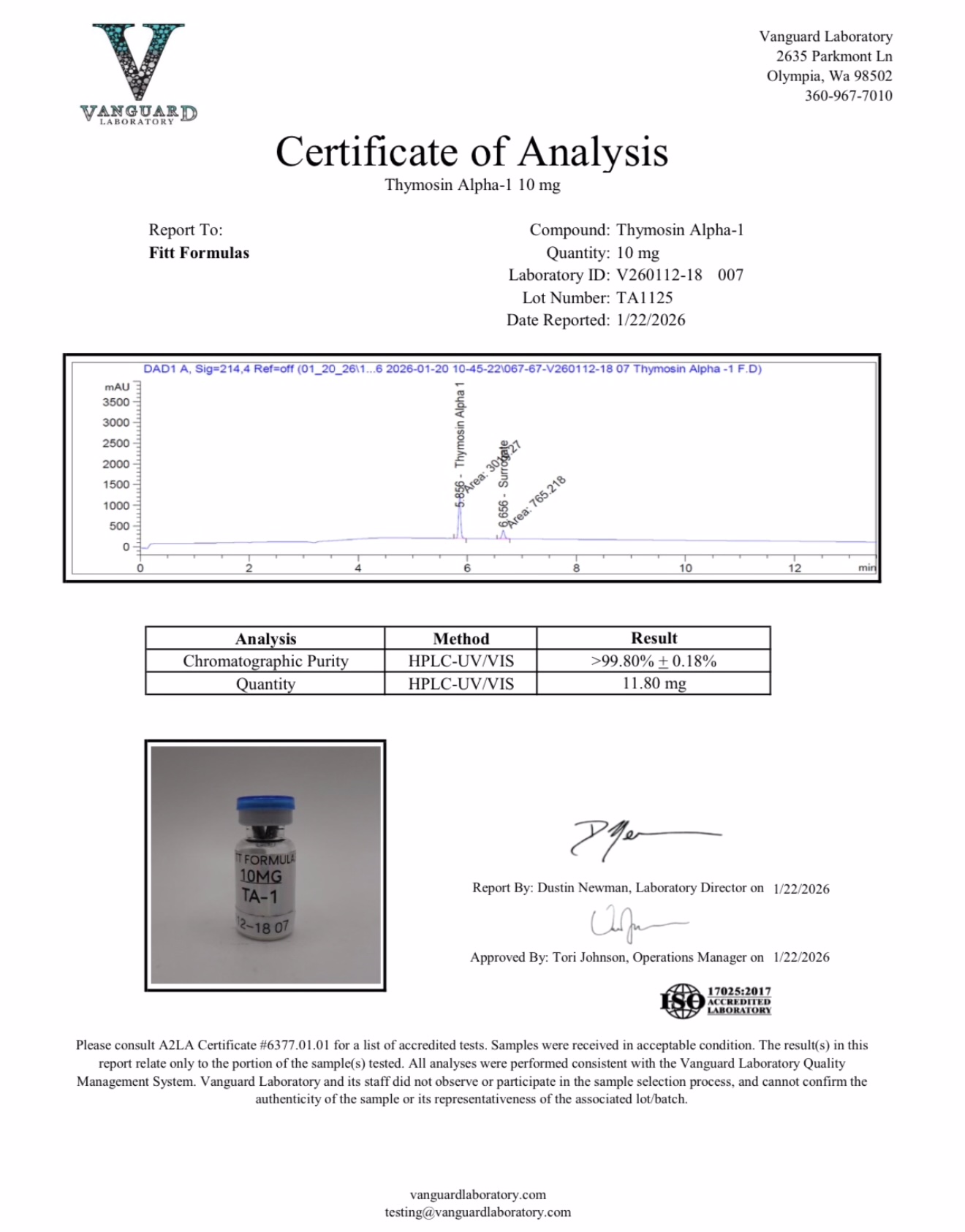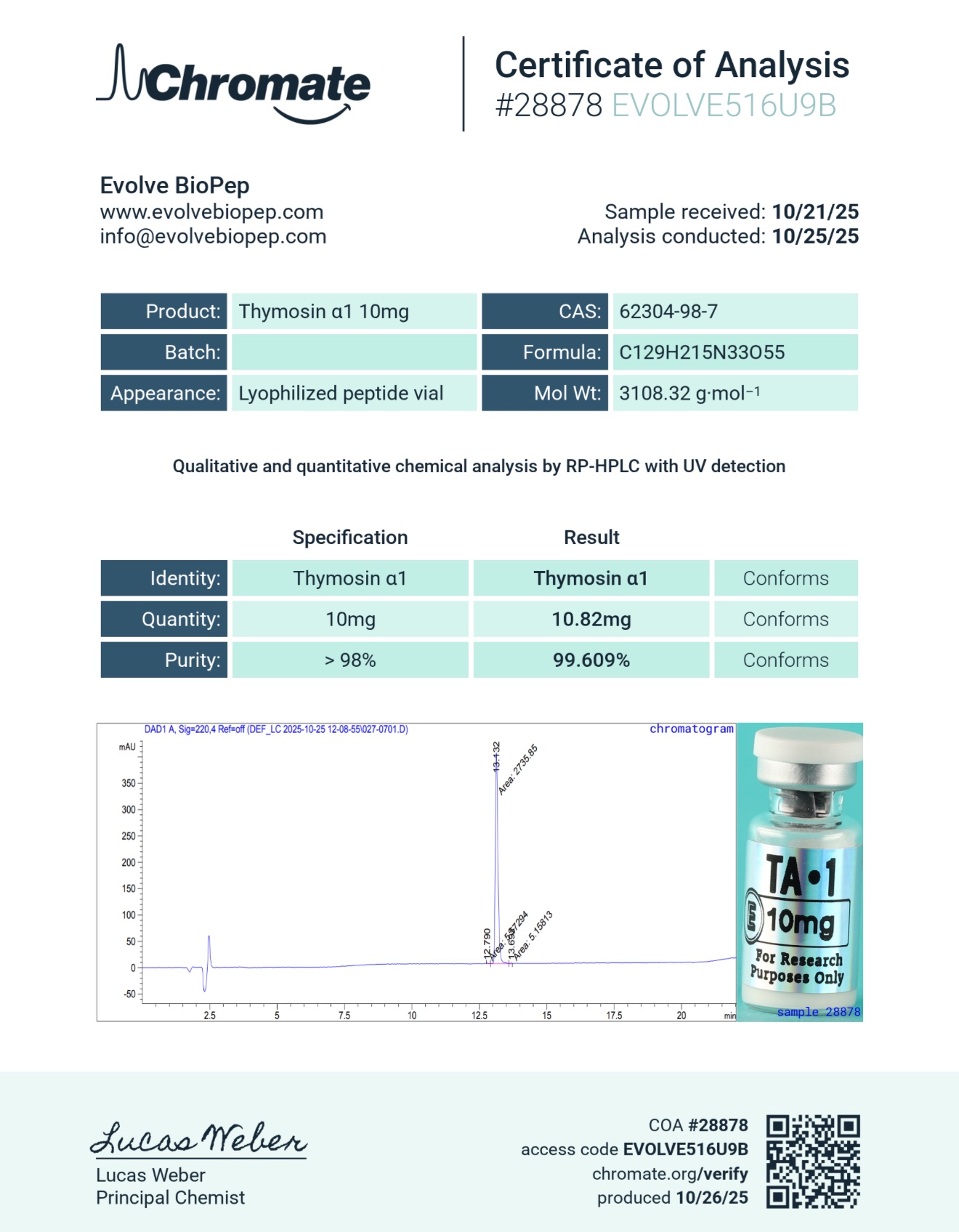 If independent confirmation is desired, identity and purity may be assessed by any properly equipped laboratory using standard analytical methods, including but not limited to HPLC, UV-Vis spectroscopy, pH analysis, or mass spectrometry.